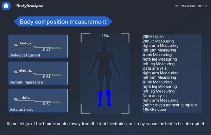 The VM1-02A is engineered for intuitive, step-by-step operation. From device startup to body composition scanning, the process is simple, fast, and easy to follow. Users can quickly input basic information, stand on the platform, hold the handles, and complete a full test in less than one minute. The 10.1-inch touchscreen provides clear visual guidance, while the system automatically processes and displays the results in real time. No professional certification is required — making it ideal for gyms, clinics, wellness centers, and mobile operators.