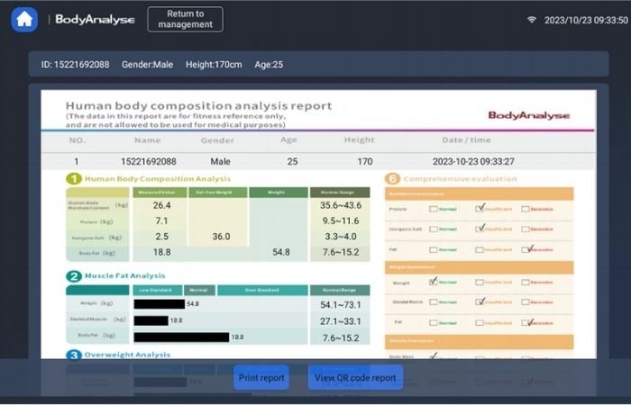 On the report page, you can slide the screen to view the full analysis. Click “Print Report” to print using an external inkjet printer. You can also view the QR code report—simply scan the code with your mobile device (phone, tablet, etc.) to access the report, save the image locally, or share the report link with others.